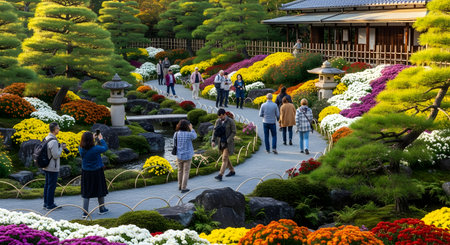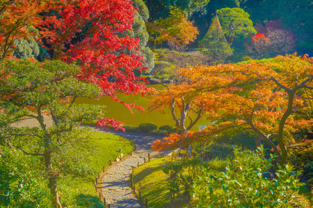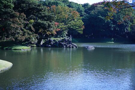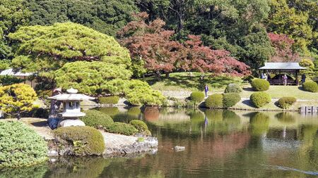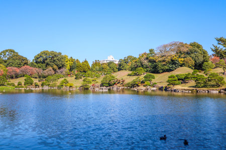 Tourists and Japanese people visit the famous and beautiful Rikugien Park during autumn season