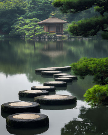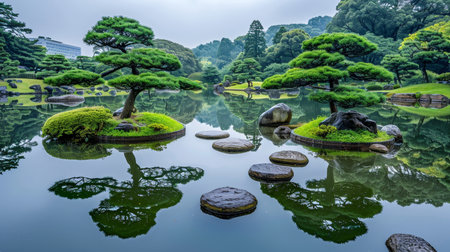 Serene Japanese Garden With Water, Stepping Stones, And Trimmed Trees Reflected In Tranquil Lake