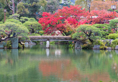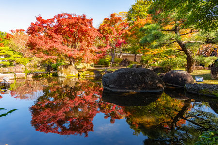 Autumn scenery with red maple trees and pond of Kokoen garden in Himeji, Japan