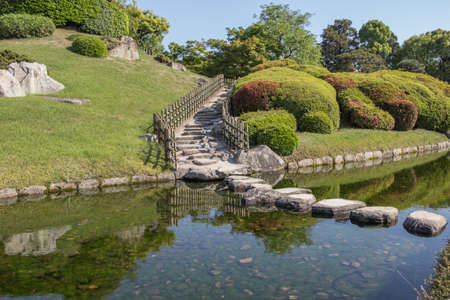 Stepping stones crossing water in the Korakuen Japanese garden in Okayama, Japan