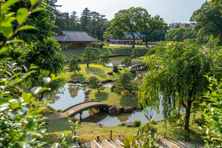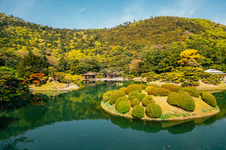Takamatsu, Japan - March 31, 2023: Ritsurin Garden in Takamatsu city, Kagawa Prefecture, Japan, one of the most famous Japanese historical gardens.