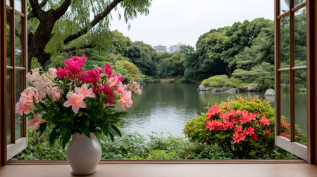 Bouquet of pink and red flowers by an open window overlooking a tranquil Japanese garden pond