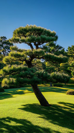 Captivating image showcasing the elegance of a Japanese black pine tree. The pine stands prominently on lush green grass, bathed in warm sunlight, creating striking shadows and serene beauty.