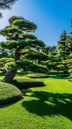 This scene features a traditional Japanese garden with meticulously manicured trees and undulating green lawns under a bright, cloudless blue sky. The crisp lighting enhances the garden's tranquility.