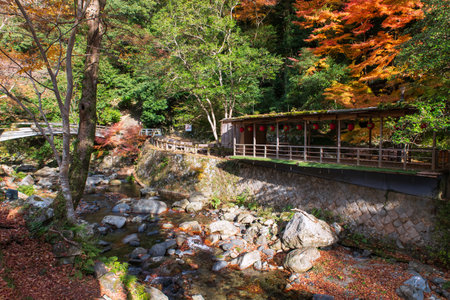 Wooden patio by bridge and canal of Minoh waterfall park with autumn foliage colors, Osaka, Japan. Famous travel destination for sightseeing Kansai in fall season.