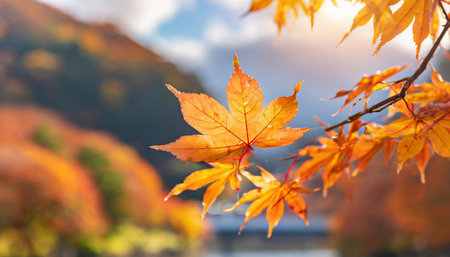 Beautiful red maple leaves at lake kinrinko, oita, Japan, in autumn sunny day