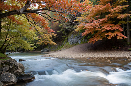 Serene Autumn Landscape With Flowing River and Colorful Foliage in the Mountains