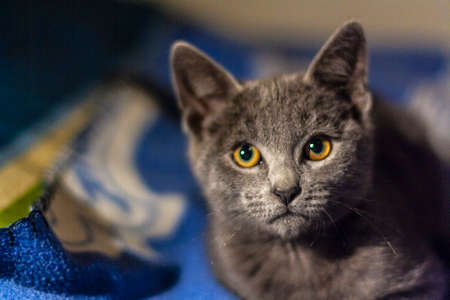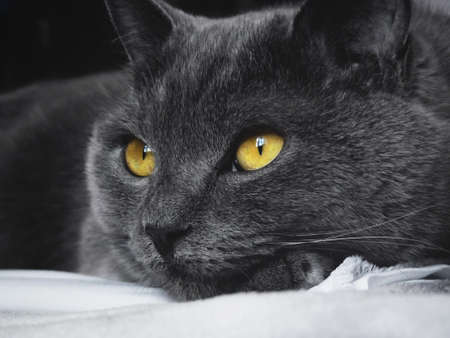British blue cat with yellow eyes lying on the bed