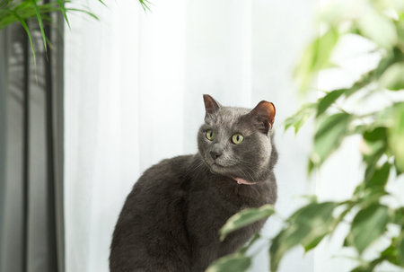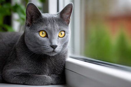 Korat cat resting near window and looking outside, enjoying the view from inside
