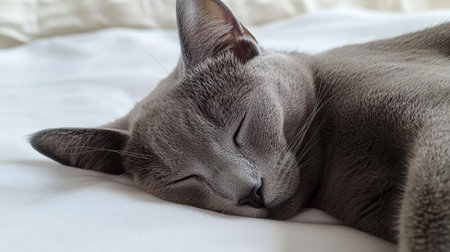 Peaceful Gray Cat Sleeping on White Bed, Close-Up Shot of Resting Feline