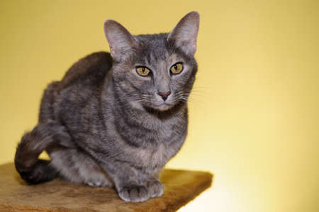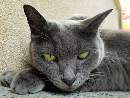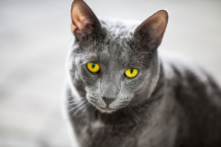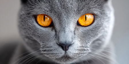 Portrait of a gray cat with yellow eyes looking at the camera