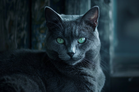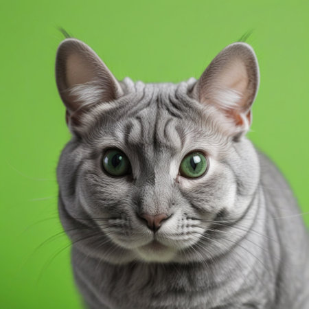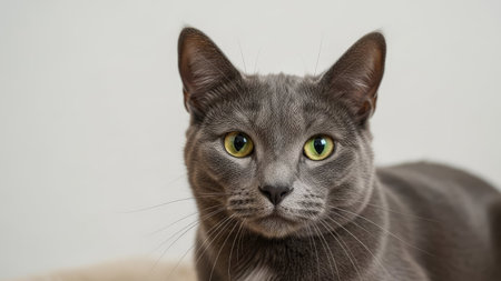 A close-up shot presents a domestic cat with soft gray fur and intense green eyes, centered against a neutral backdrop. The feline's focused gaze, highlighting textures and patterns. Suitable for commercial applications, including advertising and editorial use. This image offers versatile options for various creative projects.