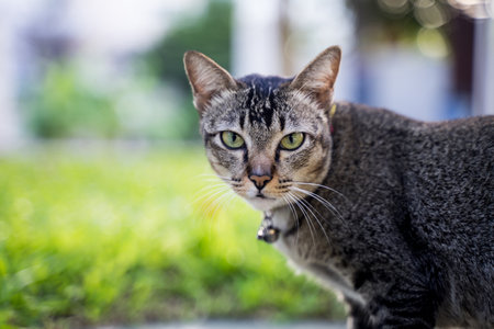The tabby cat looked solemnly. bokeh light background.