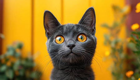 Charming Chartreux Cat Portrait with Striking Amber Eyes and Fluffy Gray Fur in a Serene Setting