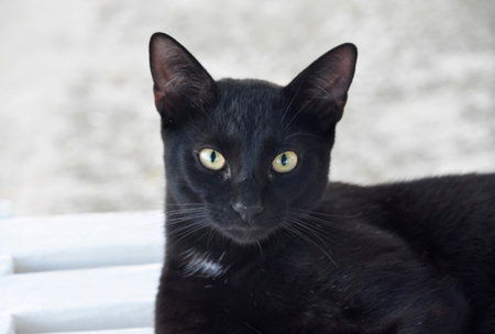 Beautiful black cat resting with piercing yellow eyes in the heat of the day.