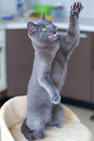 Blue cat stands and playing at home