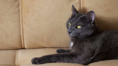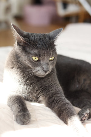 Beautiful gray cat lying on the bed at home, closeup