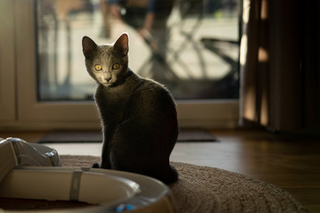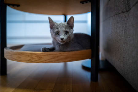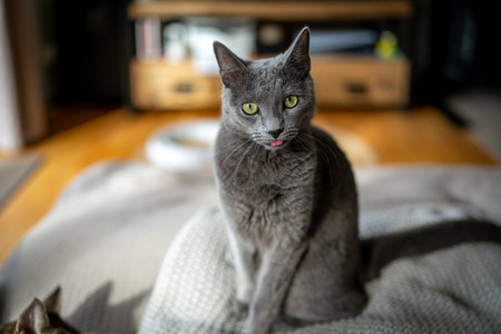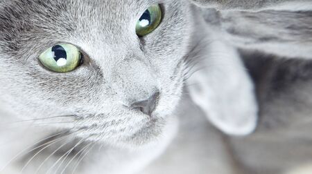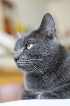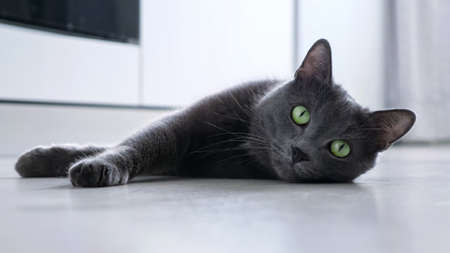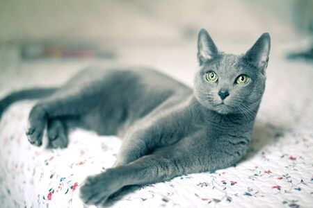 Russian blue cat living at human's home. Pet concept.