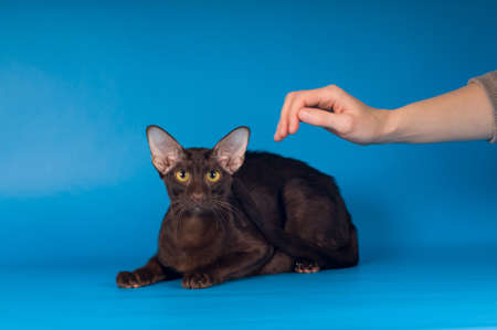 Oriental lying cat portrait on blue background