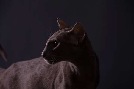 Horizontal photo of a beautiful elegant oriental cat silhouetted in the dark on a gray background indoors in the studio