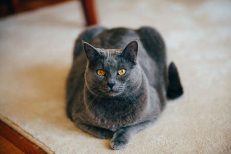 British shorthair cat with brown eyes on the carpet.