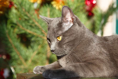 Happy russian blue cat plays with a Christmas toy. Christmas season, new year, holidays and celebration. Funny cat sitting at home. Naughty cute kitten. Christmas cat.