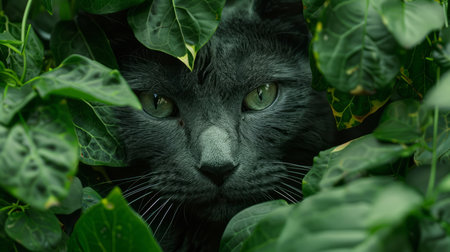 In the heart of an enchanting wilderness, a sleek black cat melds seamlessly with its verdant surroundings Its emerald eyes pierce through the dense foliage, revealing a masterful symphony of stealth and camouflage Nature's meticulous artistry transforms the feline into a living shadow, blurring the boundaries between predator and prey amidst the vibrant tapestry of life AI Generative