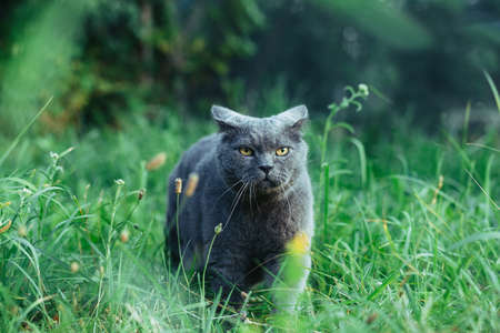 British adult cat presses ears and sneaks in the grass