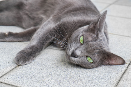 Cute gray cat lying on the ground and looking something