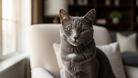 A close-up portrait shows a gray cat with green eyes. The cat is seated on a cream-colored chair, bathed in soft lighting. The composition is balanced and inviting, with a blurred background suggesting an interior setting. This image may be suitable for advertising, editorial, or decorative purposes.