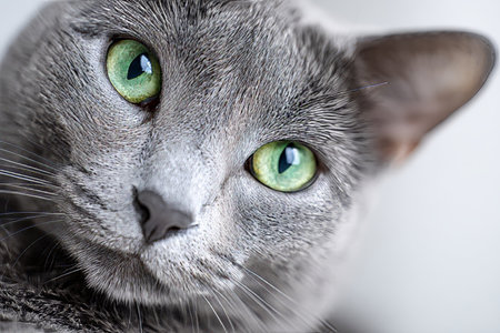 A close-up shot of a grey domestic cat with striking green eyes. The cat is positioned against a plain, light-colored background. The image highlights the cat's fur texture and eye detail. This image is suitable for various commercial uses, including advertising and editorial content.