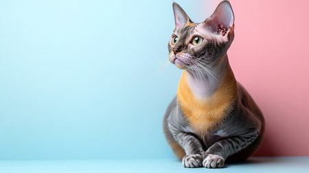 A graceful cat with a unique coat poses on a pastel backdrop, exuding beauty.