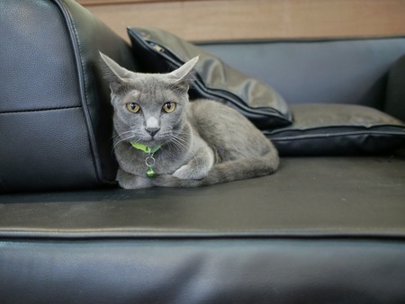 Cat grey color on the black sofa