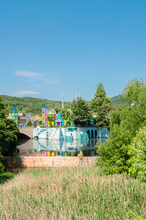Pocheon, South Korea – 10 May, 2017: fantasy place with colorful buildings and sculptures at Herb Island with mountains and cloudscape on background