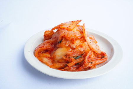 Kimchi cabbage. Korean traditional cabbage kimchi, fermented cabbages, in a white plate. Closeup.