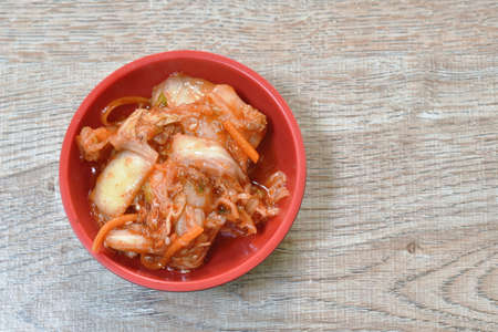 Traditional Korean Kimchi in a bowl on wooden background, top view, Korean food ,Korean food traditional cuisine. Fermented food. Vegetarian food good for health, Vegan for weight control diet