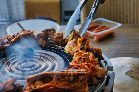 Close-up of meat grilling on a Korean style barbecue grill with tongs