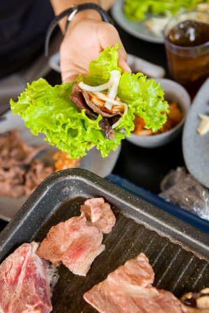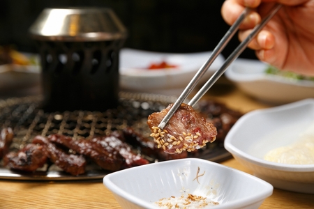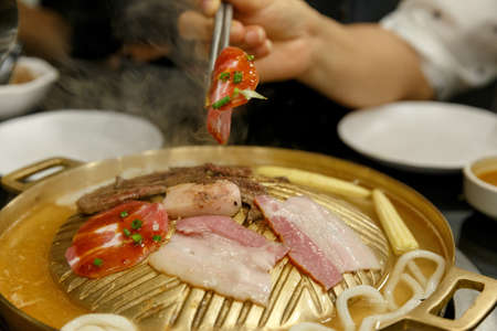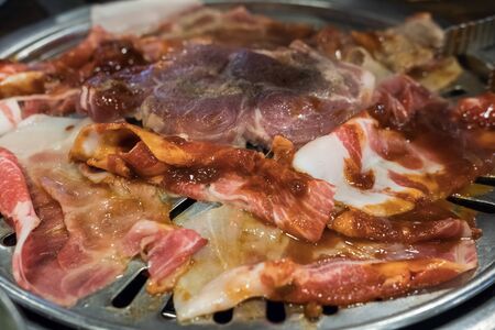 Korean Style Barbecue Grill BBQ rare meat with soft focus