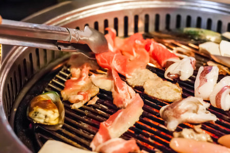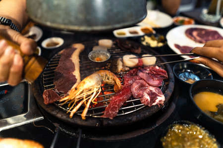Korean Style Barbecue Grill BBQ rare meat with shrimp