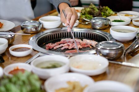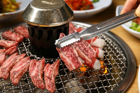 Korean beef barbecue on hot coals. Grilling meat pork Korean BBQ traditional style on stove serve in restaurant, Japanese food