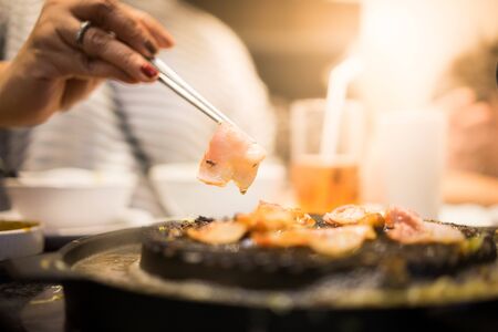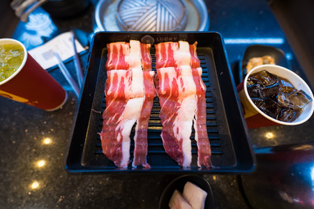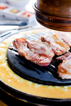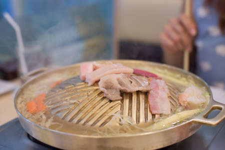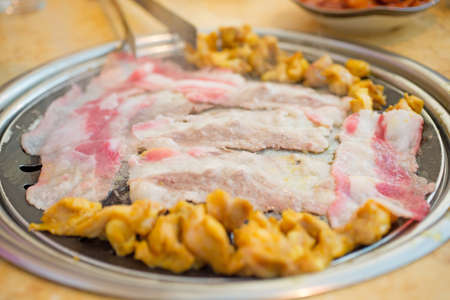 Selective focused Samgyeopsal or Korean BBQ , pork belly on grilling pan.