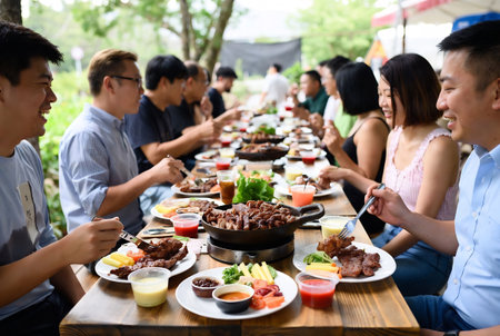 Gathered around a grill, friends are savoring and enjoying delicious, perfectly barbecued meat