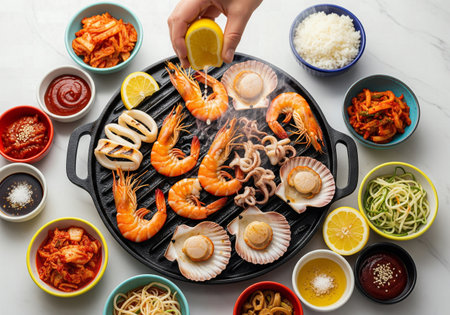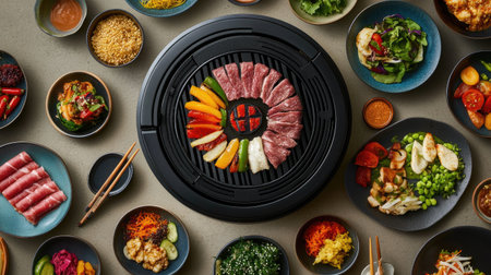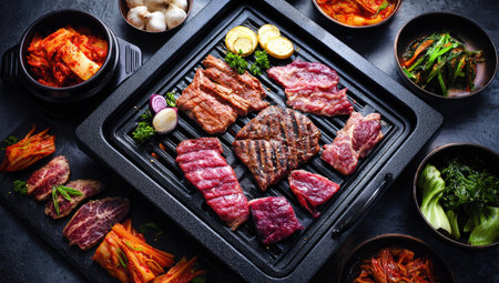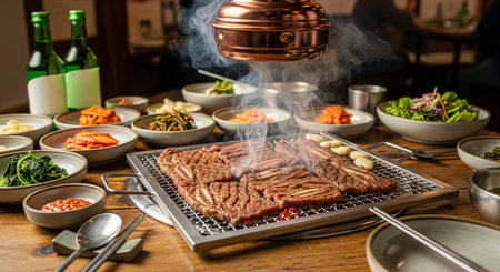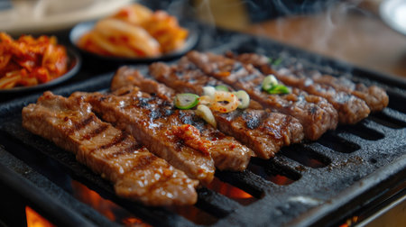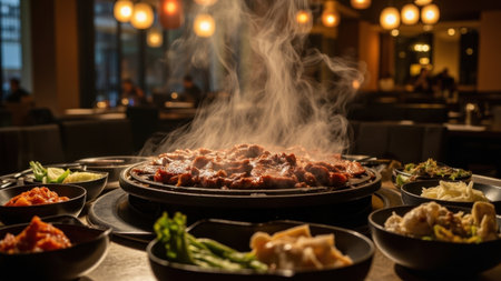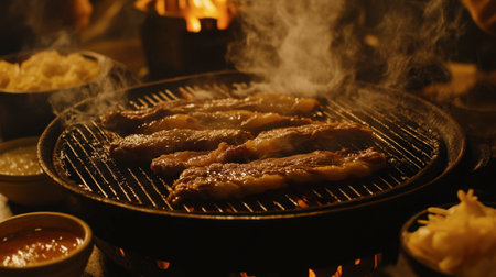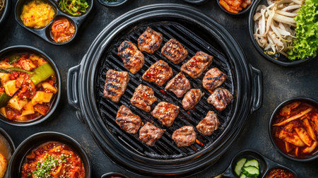 Delicious Korean BBQ sizzling on a grill, surrounded by colorful side dishes