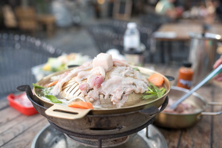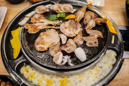 Thai style barbecue. It is the popular food in Asia by grill the pork, meat or sea food on the hot pan that can put the soup of vegetable around a pan too. Thai barbecue grill Pork on hot pan buffet.