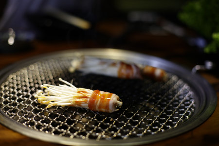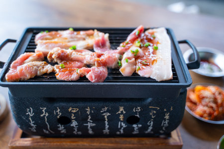 Sizzling pork slices grill on charcoal, Korean or Japanese BBQ style cuisine.