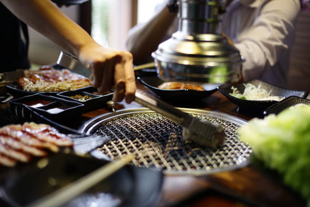 People grilling Korean barbeque on the restaurant