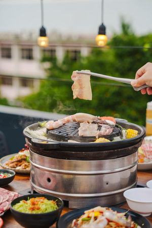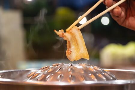 Hand using chopstick to tongs pork and beef on charcoal stove with soup in BBQ restaurant