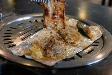 grilled slice poek with charcoal stove,korean barbecue