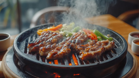 A sizzling BBQ grill with pieces of marinated pork and vegetables cooking on the hot surface, with steam rising and a few dipping sauces beside it
