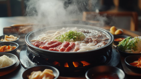 A vibrant hot pot meal featuring an array of fresh ingredients and dipping sauces set on a lively table. Perfect for sharing among friends and family.